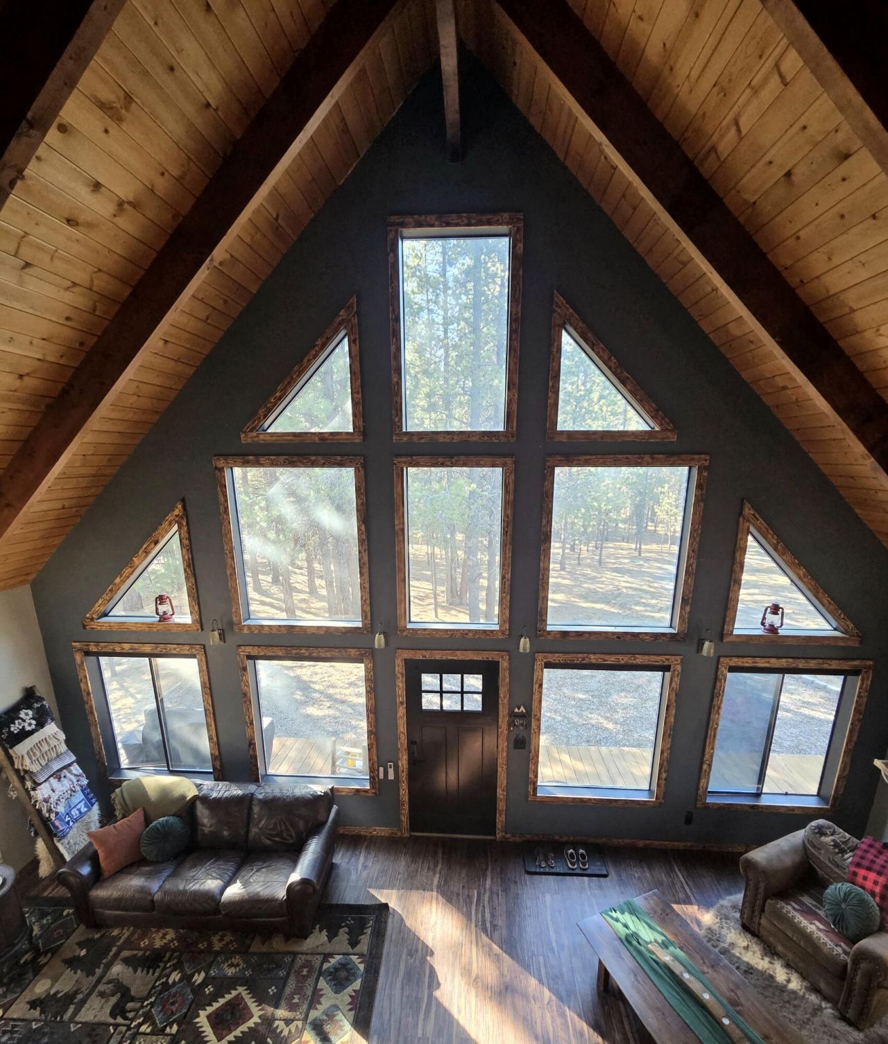 A rare opportunity to purchase 8.35 acres that backs up to Shanda & BLM property. Quiet & private, nestled in the tall pines rests this A-frame/Chalet home. The open-concept living, dining, & kitchen features vaulted ceilings, large windows w/motorized blackout blinds, & abundant natural lighting for peaceful viewing. A custom lava rock feature for the wood stove setting. Home recently has been updated w/new flooring, the main floor Master Bathroom features a custom tile walk-in shower, sink, & more. The kitchen is stunning w/custom granite countertops, new cabinets & white farm sink. Large pantry. Half bath & laundry room is in the hall that leads to the 2 car garage. The stunning custom designed upstairs & staircase railing tells its own story, which leads to the second story featuring 2 bdrms., a full bath and a loft/family room area. A mini-split provides cooling/heating as needed. Outdoors you have a wrap deck on the home. A circle drive. Woodshed. Firewise.