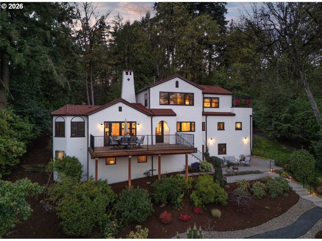 Perched in Portland's coveted SW Hills, this 1925 Mediterranean / Spanish Revival 4 bed 3 bath home + ADU was built at a time when the city's most discerning homeowners first chose elevation, privacy, luxury, views, and proximity to downtown. Completely restored with Restoration Hardware and beautiful millwork. The layout is thoughtfully scaled for both privacy and entertaining. The main level features refinished oak hardwood floors through the kitchen, dining, living rooms, den, an additional bedroom and full bathroom for main level living along with french doors and a romantic arched loggia that frames sweeping Mt. Hood & Willamette River views and opens up to a huge entertainer's deck for an unforgettable indoor-outdoor experience. The upper floor is dedicated entirely to a nearly 800 SF owner's suite, featuring a bedroom with private upper terrace, a sitting room, walk-in closet with laundry, and a private ensuite bathroom with walk-in shower, soaking tub, and heated floor. The lower level serves as a perfect guest retreat, offering a family room, two bedrooms, full bathroom, laundry/kitchenette, and an exterior door and breezeway leading to an expansive lower terrace. Completing the estate is a 400 SF detached ADU (recently rented for $1250), providing a full kitchen, bathroom, and a versatile living/sleeping area, also with a door to the lower terrace. Professional landscaping and hardscaping complete this exquisitely renovated architectural delight. Upper floor and lower floor furnaces and A/C units each have their own thermostat. ADU has mini-split. PARKING for one in driveway off of Terwilliger Parkway or walk the stairs up from Hamilton Terrace.